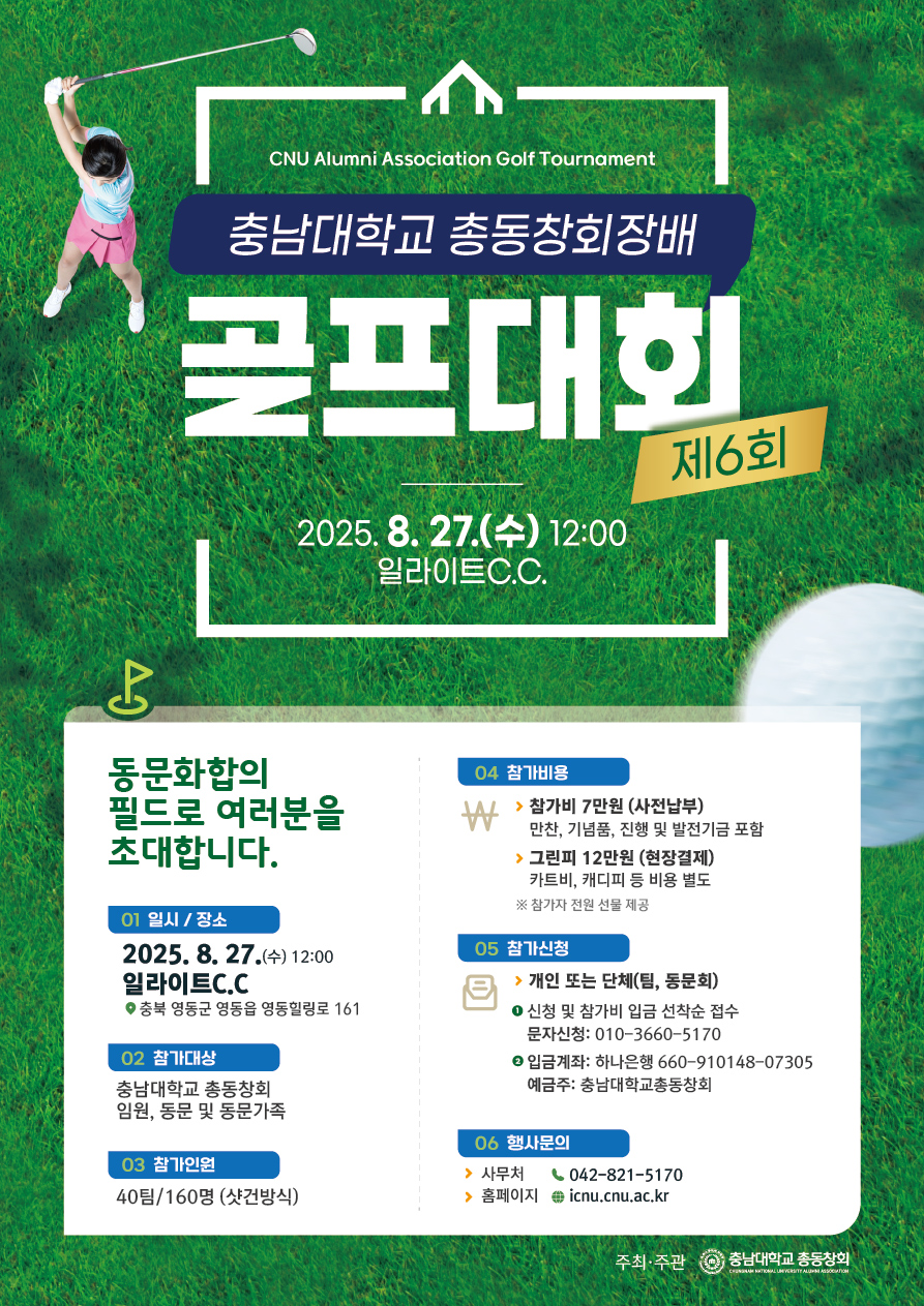 ◈ 제6회 충남대학교 총동창회장배 골프대회 ◈ [대회개요] · 일시: 2025.8.27.(수) 12:00 · 장소: 일라이트CC (충북 영동) · 인원: 40팀 160명 예정 (샷건 방식) · 대상: 충남대학교 동문, 동문가족, 교직원 및 초청내빈 · 비용: 참가비 7만원 (사전입금) - 만찬, 선물, 진행 및 발전기금 포함 - 중식 미포함 ※그린피 12만원 및 캐디피/카트비/그늘집 비용 개별 정산 (현장결제) [진행순서] · 11:20~ 참가자 등록(기념품수령) 및 체크인(그린피, 카트비 결제) · 12:00~ 개회식 및 시타 (스타트광장) · 12:20~ 각 홀로 이동 · 12:35~ 동시 티오프 · 18:00~ 시상 및 만찬 · 20:00~ 폐회 [참가신청] ★ 신청 접수 마감 되었습니다. · 개인 또는 단체(팀) 신청 가능 · 참가비 입금 및 인적사항 <성명, 학과, 입학연도, 직장(소속) 및 직함, 연락처> 기재하여 문자(010-3660-5170) 또는 이메일로 신청해 주시기 바랍니다. -단체, 팀별 신청 시 인원 및 참가비 납부방식(일괄 또는 개별)을 알려주시고 참가자 명단은 취합하여 보내주시기 바랍니다. ※ 참가비 입금에 따라 접수가 완료되며, 기한 내 미입금 시 취소될 수 있습니다. [참가비 및 후원금 입금 계좌] · 하나은행 660-910148-07305 (예금주:충남대학교총동창회) ※ 개별입금: 신청자명 기재 단체입금: 단체명 또는 신청 대표자명 기재 [접수 및 문의] 문자신청 010-3660-5170 이메일 cnuaa@cnu.ac.kr 사무처☎ 042-821-5170